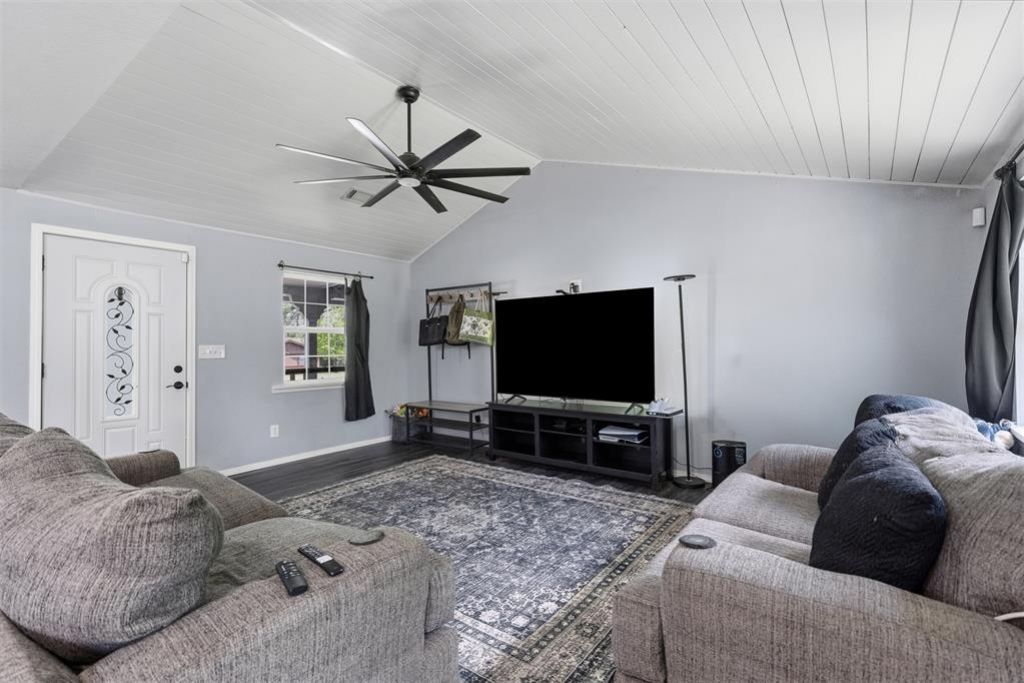 2-bedroom, 1-bath home featuring an open-concept living and kitchen layout with vaulted ceilings in the living area. The kitchen includes a large island with granite countertops, storage underneath, a pantry, an oversized farmhouse sink with a tall faucet and sprayer, and a glass tile backsplash. Additional granite surfaces are carried throughout the home.The property is total electric and includes double-pane windows for energy efficiency. The living area provides access to the backyard through patio doors that open onto a deck. Interior finishes are completed in neutral gray tones, offering a bright and cohesive feel.Exterior features include a large backyard with privacy fencing, asphalt driveway, covered porch, and a 2-car carport for parking. A storm shelter is also located on the property. The home is equipped with 30 solar panels for added energy savings.